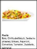 Köstliche Paella nach spanischem Originalrezept mit Garnelen, Tintenfisch, Alaska-Seelachs, Hähnchenbrustinnenfilet-Stücken, Muscheln, Gemüse und pikant gewürztem Reis.